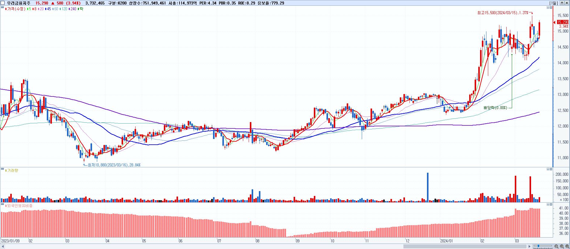- 우리금융지주 (15,290원 ▲ 3.94% , 시총: 114,973억, 외국인 순매수 거래금:150억)
