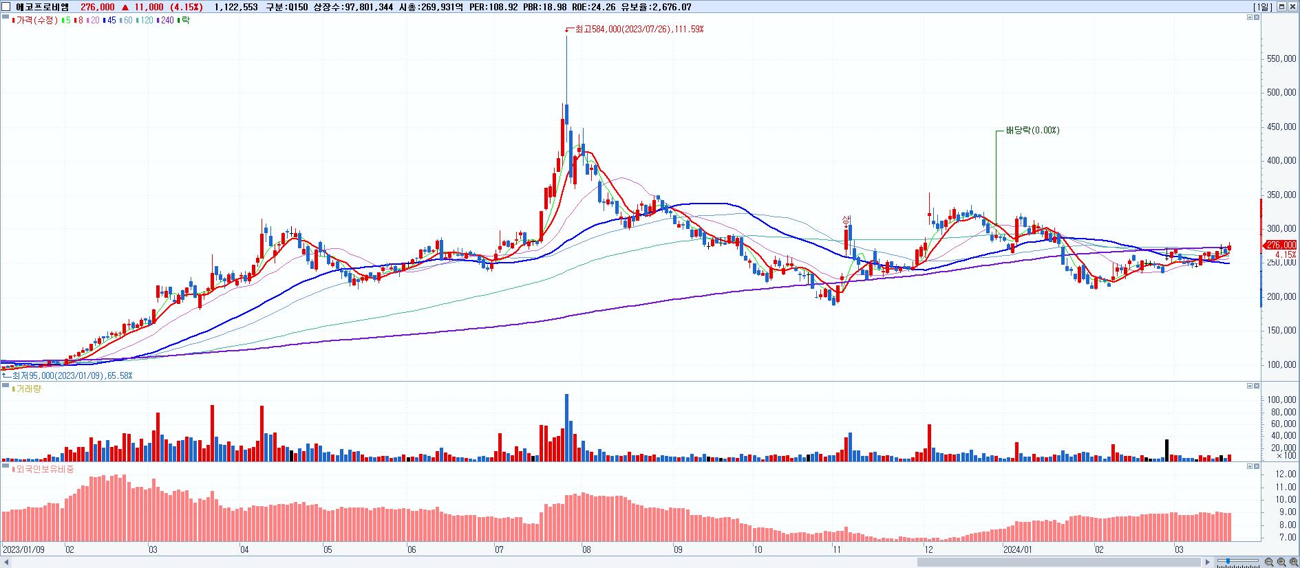 - 에코프로비엠 (276,000원 ▲ 4.15% , 시총: 269,932억, 외국인 순매수 거래금:554억)