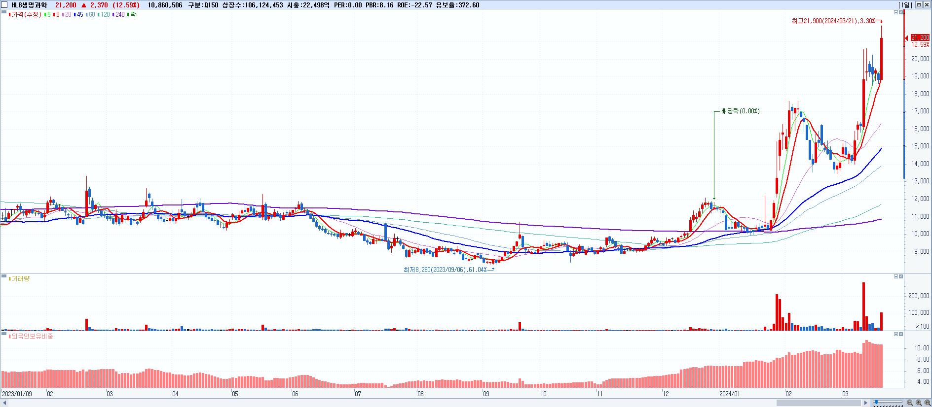 - HLB생명과학 (21,200원 ▲ 12.59% , 시총: 22,498억, 외국인 순매수 거래금:143억)