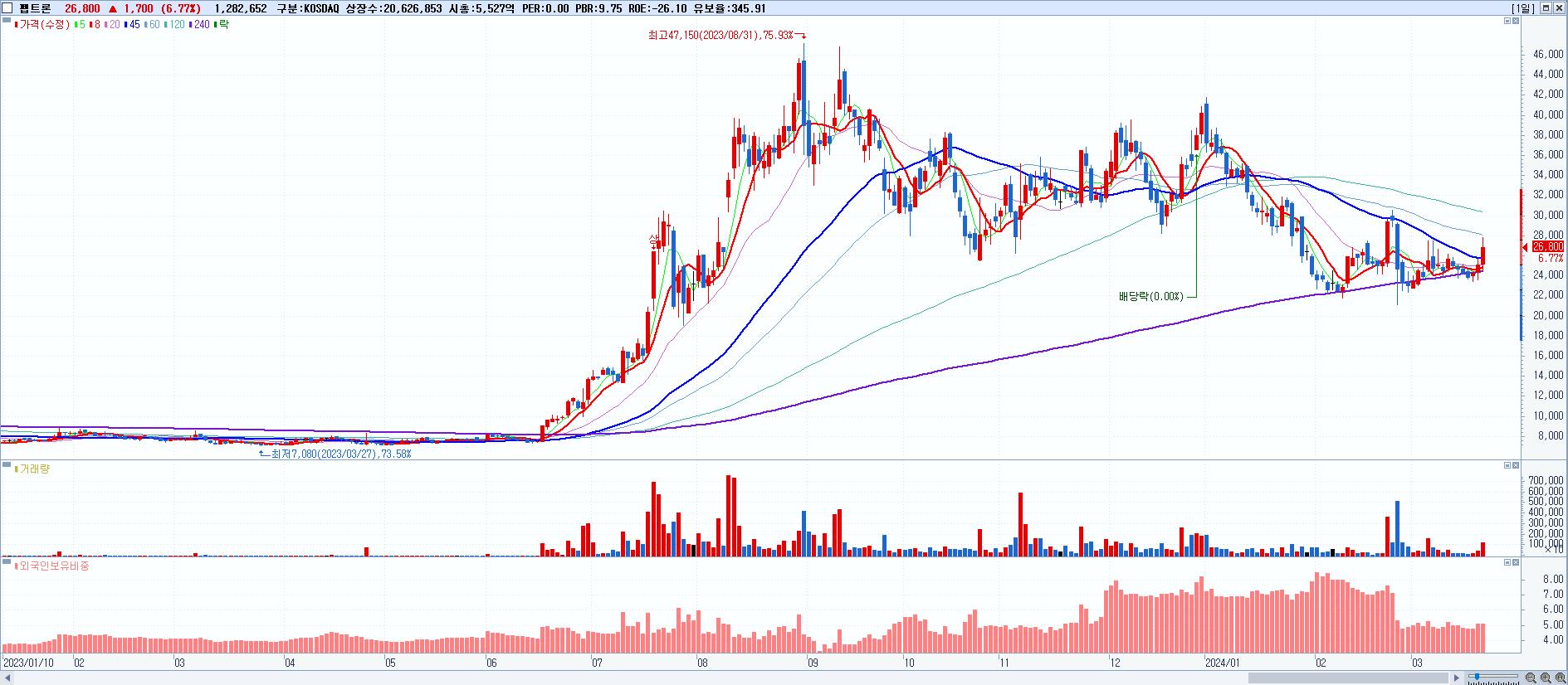 시총: 3,595억 거래량: 5,486,120 거래대금:453억