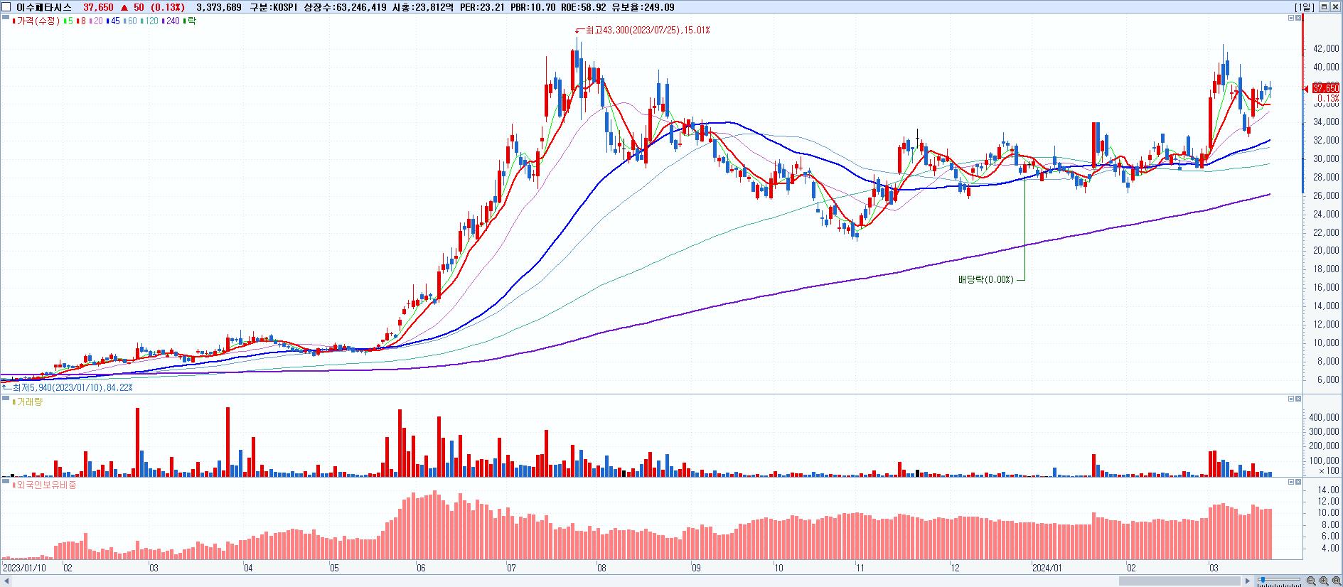 - 이수페타시스 (37,650원 ▲ 0.13% , 시총: 23,812억, 외국인 순매수 거래금:69억)
