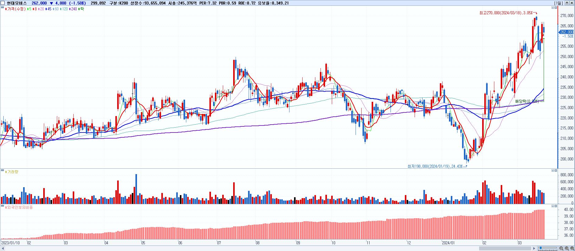 - 현대모비스 (262,000원 ▼ -1.5% , 시총: 245,376억, 외국인 순매수 거래금:52억)