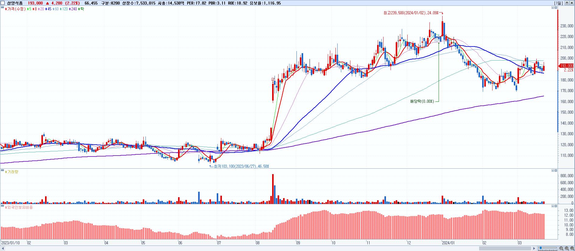 - 삼양식품 (193,000원 ▲ 2.22% , 시총: 14,539억, 외국인 순매수 거래금:42억)