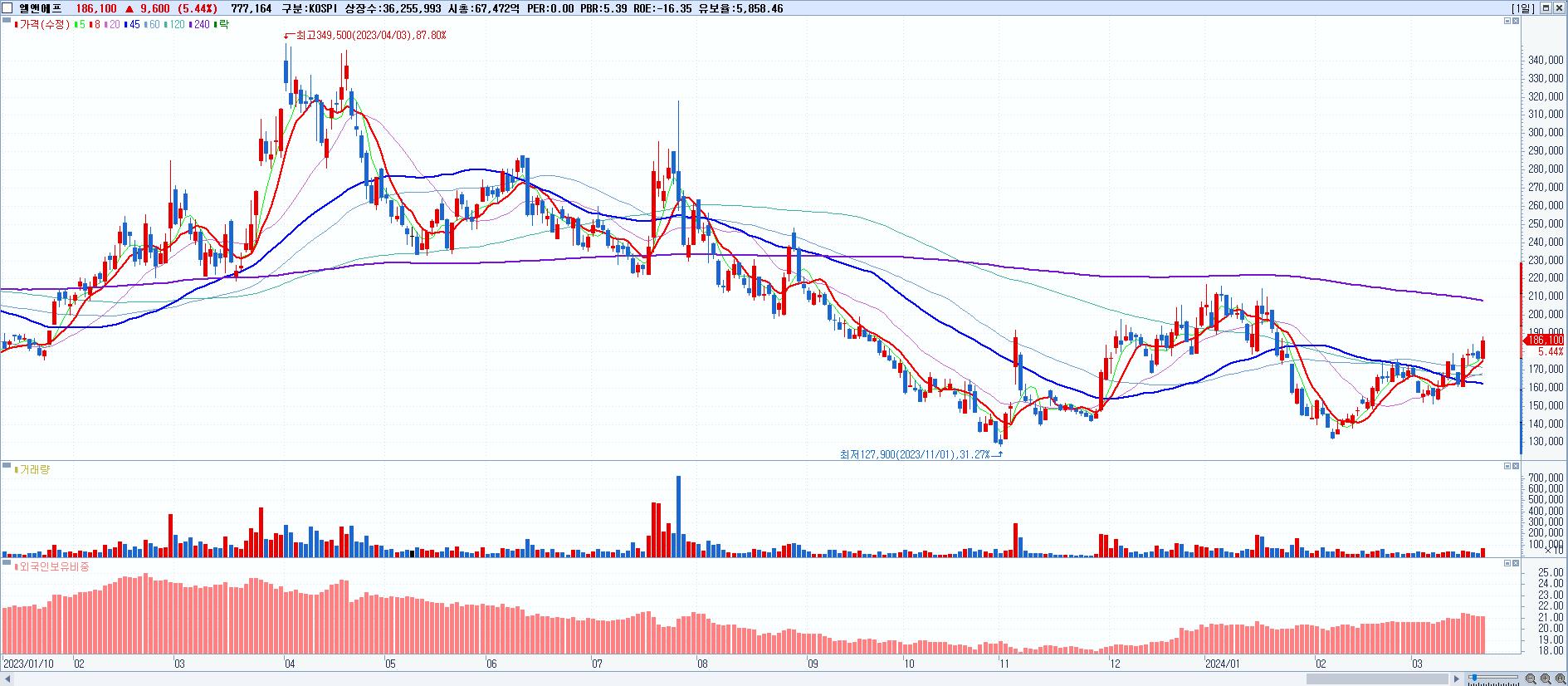 - 엘앤에프 (186,100원 ▲ 5.44% , 시총: 67,472억, 외국인 순매수 거래금:132억)