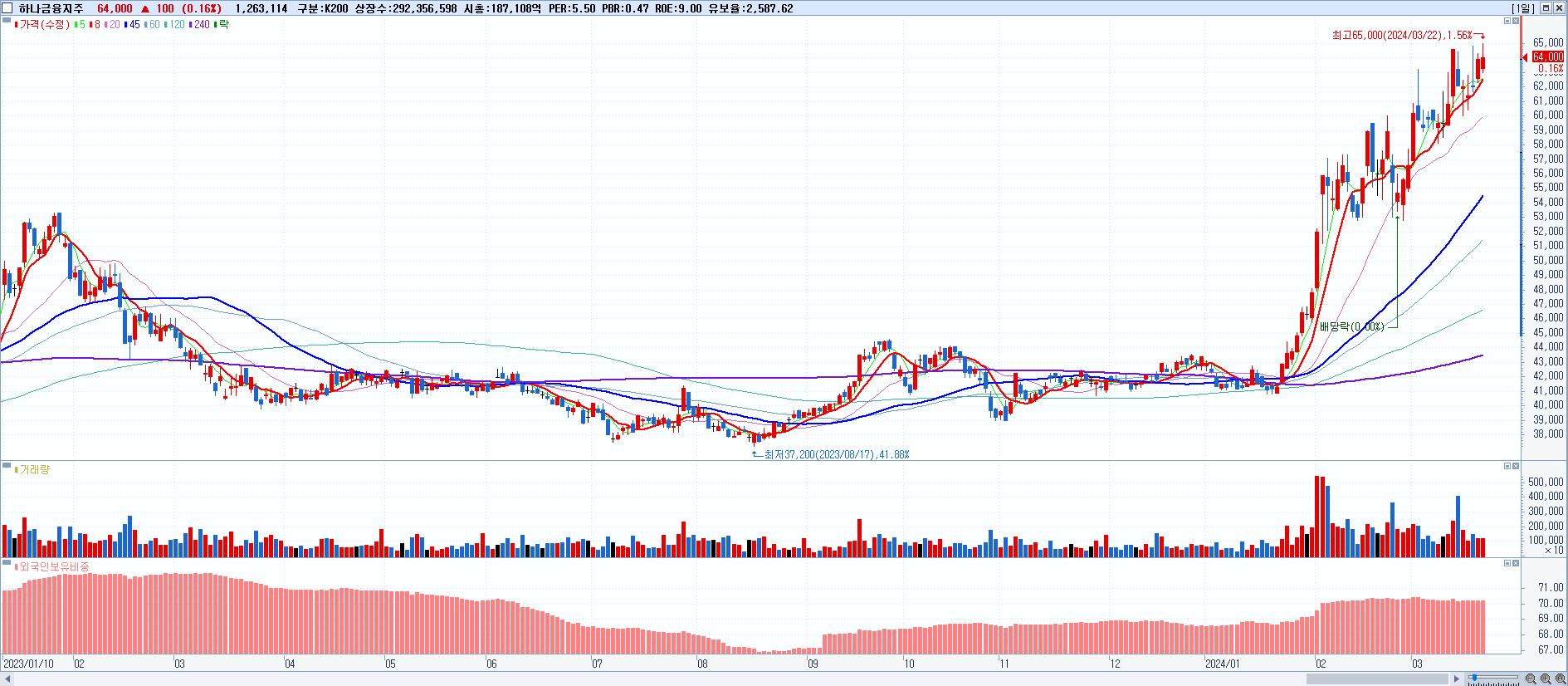 - 하나금융지주 (64,000원 ▲ 0.16% , 시총: 187,108억, 외국인 순매수 거래금:91억)