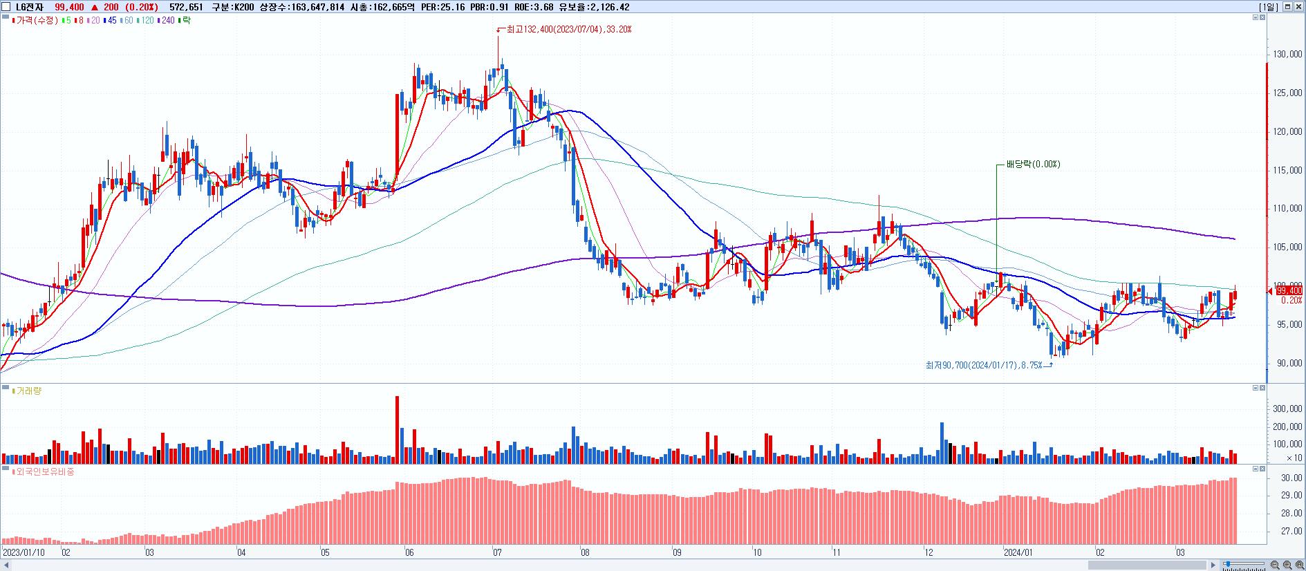 - LG전자 (99,400원 ▲ 0.2% , 시총: 162,666억, 외국인 순매수 거래금:119억)