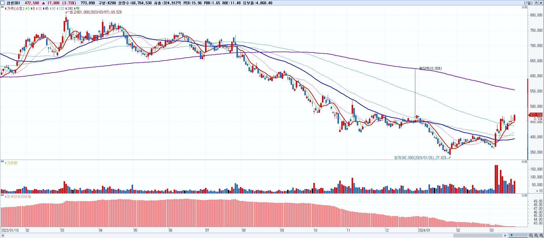 - 삼성SDI (472,500원 ▲ 3.73% , 시총: 324,912억, 외국인 순매수 거래금:460억)