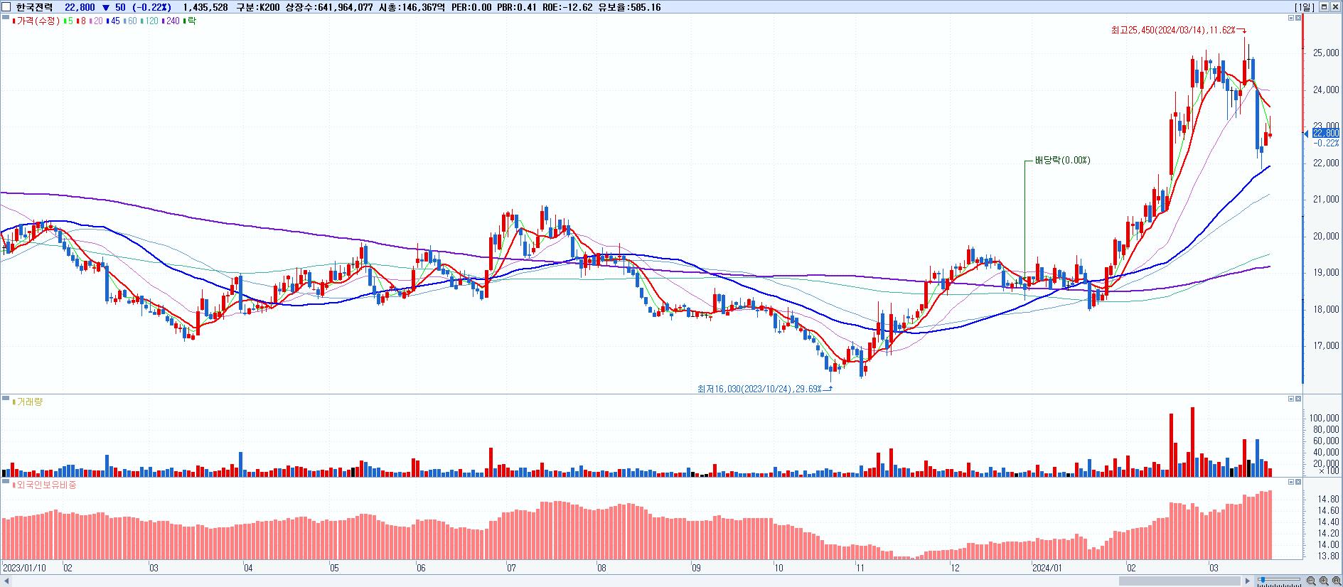 - 한국전력 (22,800원 ▼ -0.22% , 시총: 146,368억, 외국인 순매수 거래금:45억)
