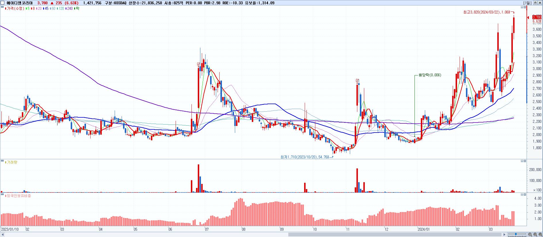 - 에이디엠코리아 (3,780원 ▲ 6.63% , 시총: 825억, 거래량: 1,421,757, 거래대금:53억, KOSDAQ)