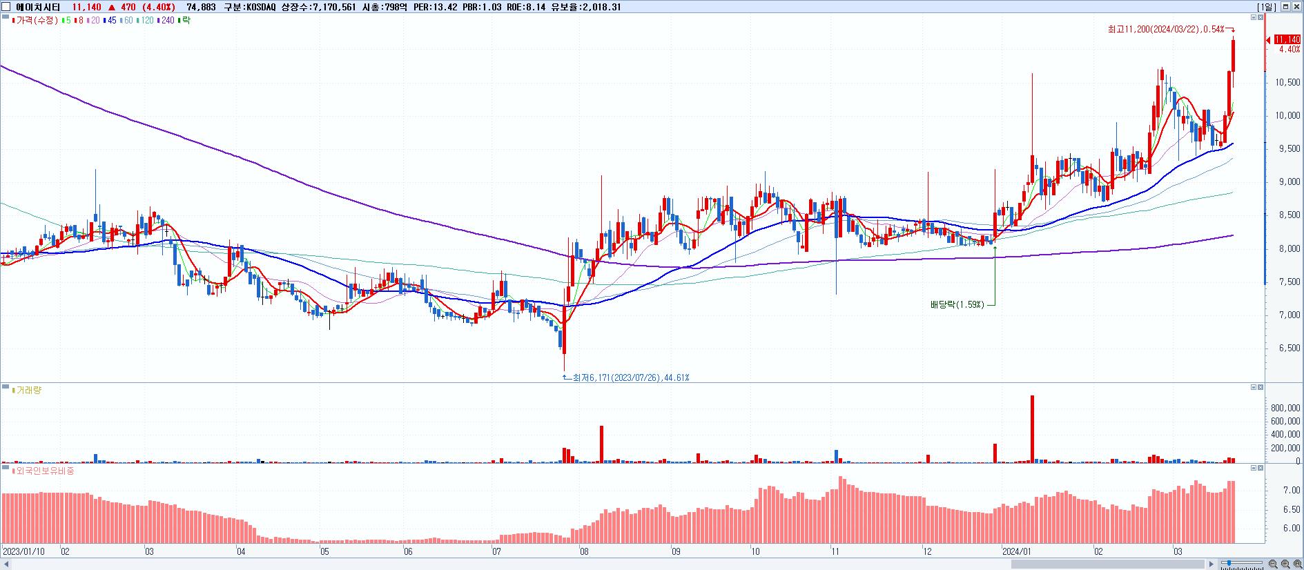 - 에이치시티 (11,140원 ▲ 4.4% , 시총: 799억, 거래량: 74,883, 거래대금:8억, KOSDAQ)