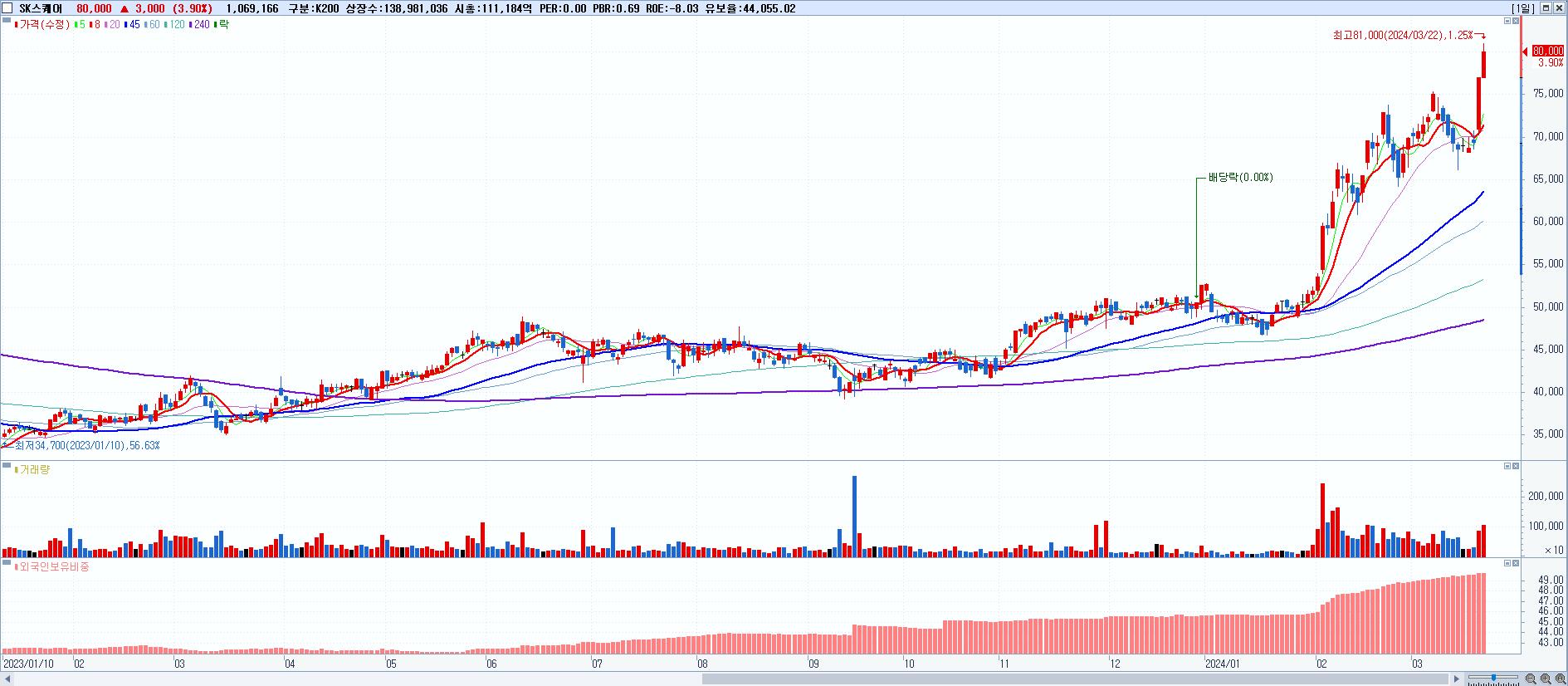 - SK스퀘어 (80,000원 ▲ 3.9% , 시총: 111,185억, 거래량: 1,098,348, 거래대금:875억, KOSPI)