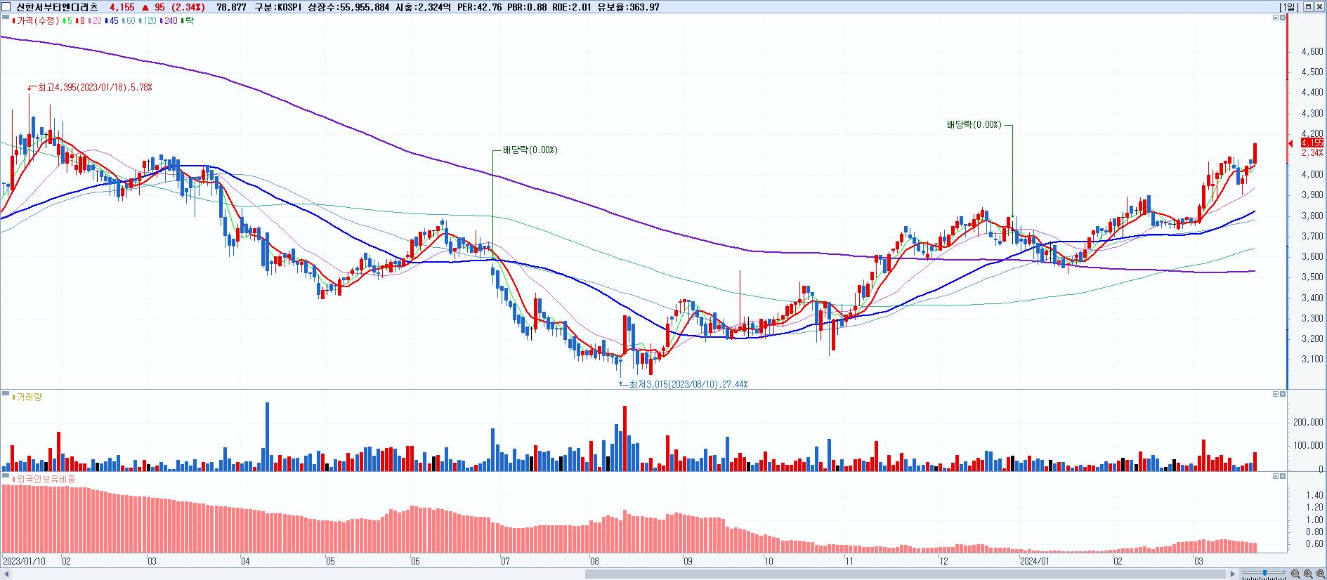 - 신한서부티엔디리츠 (4,155원 ▲ 2.34% , 시총: 2,325억, 거래량: 78,877, 거래대금:3억, KOSPI)