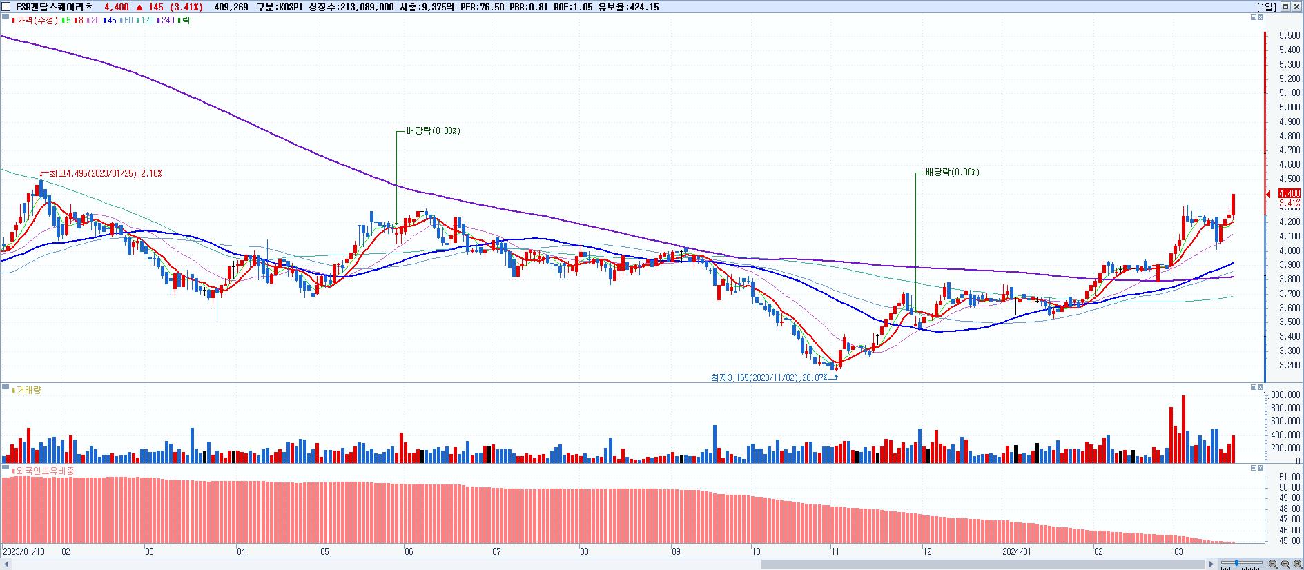 - ESR켄달스퀘어리츠 (4,400원 ▲ 3.41% , 시총: 9,376억, 거래량: 409,269, 거래대금:18억, KOSPI)
