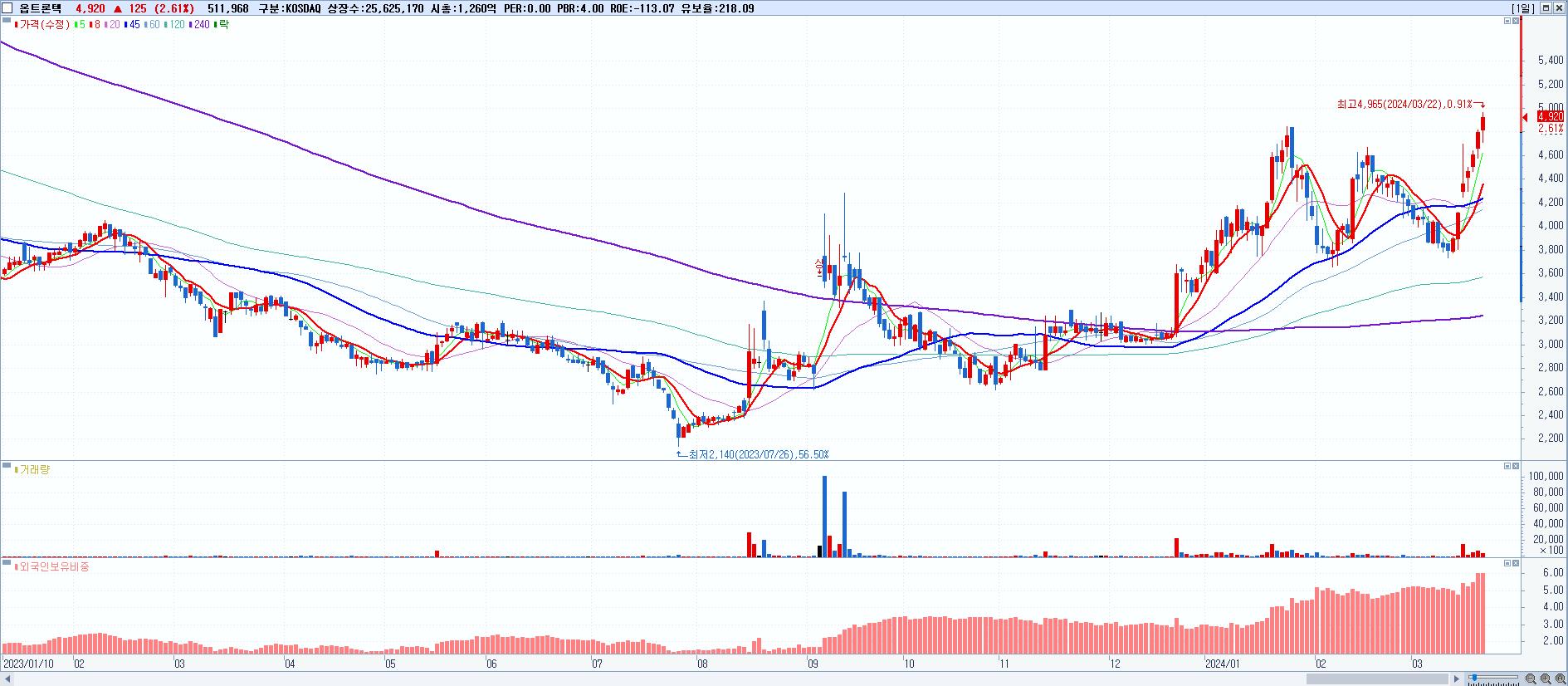 - 옵트론텍 (4,920원 ▲ 2.61% , 시총: 1,261억, 거래량: 511,968, 거래대금:25억, KOSDAQ)