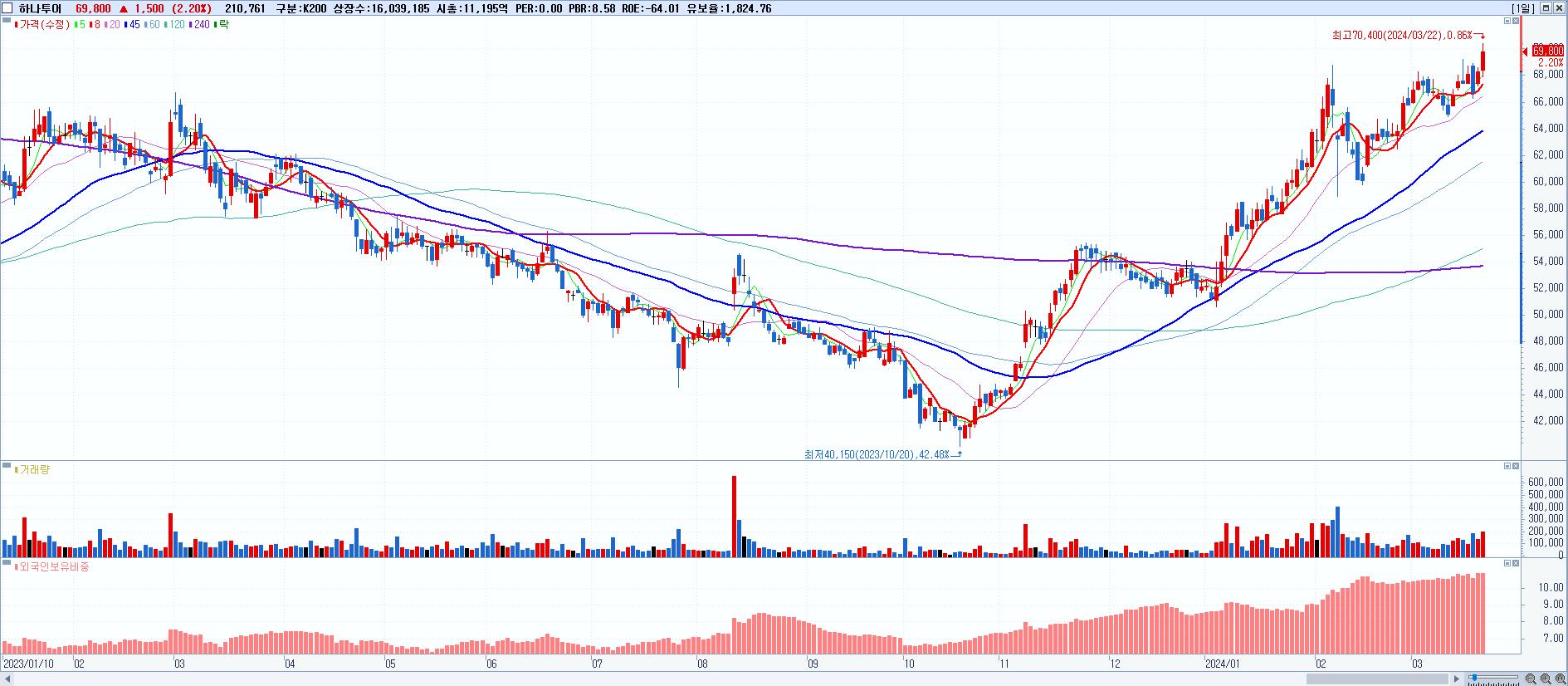 - 하나투어 (69,800원 ▲ 2.2% , 시총: 11,195억, 거래량: 210,791, 거래대금:147억, KOSPI)