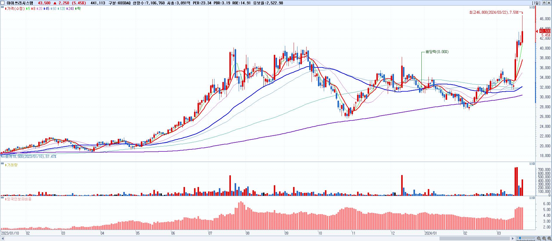 - 아이쓰리시스템 (43,500원 ▲ 5.45% , 시총: 3,091억, 거래량: 441,169, 거래대금:197억, KOSDAQ)