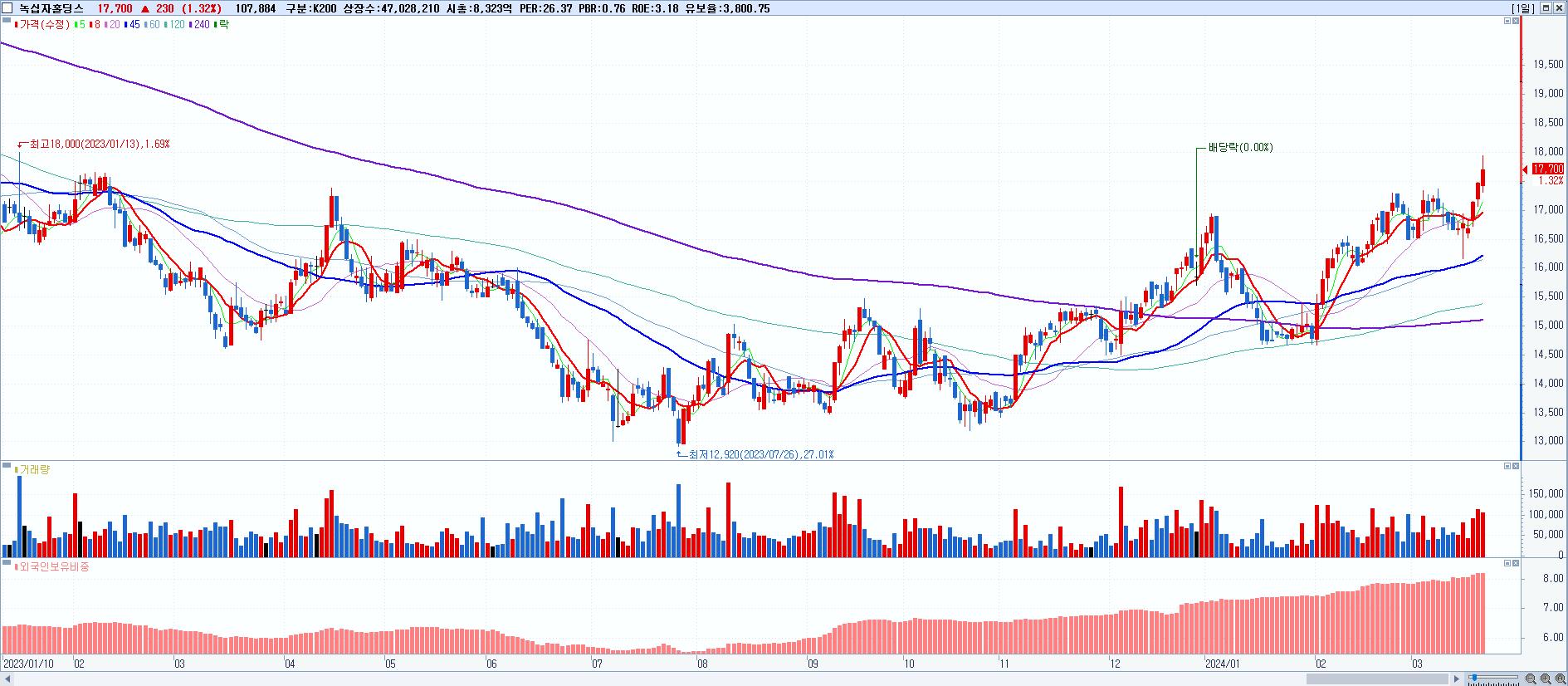 - 녹십자홀딩스 (17,700원 ▲ 1.32% , 시총: 8,324억, 거래량: 107,884, 거래대금:19억, KOSPI)