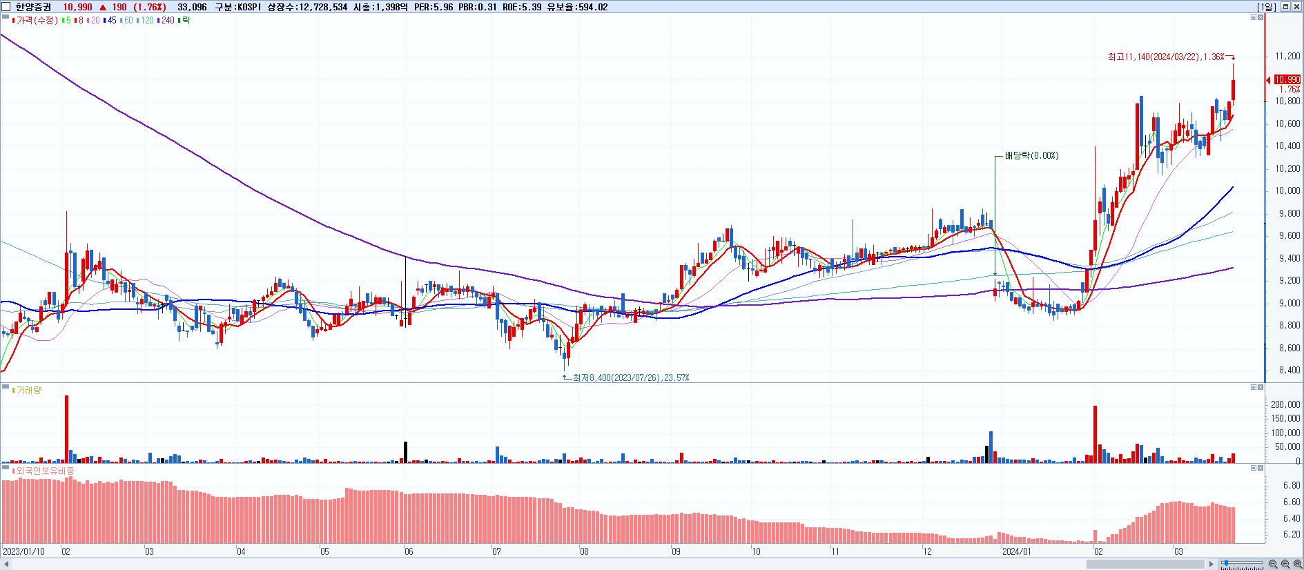 - 한양증권 (10,990원 ▲ 1.76% , 시총: 1,399억, 거래량: 33,096, 거래대금:4억, KOSPI)