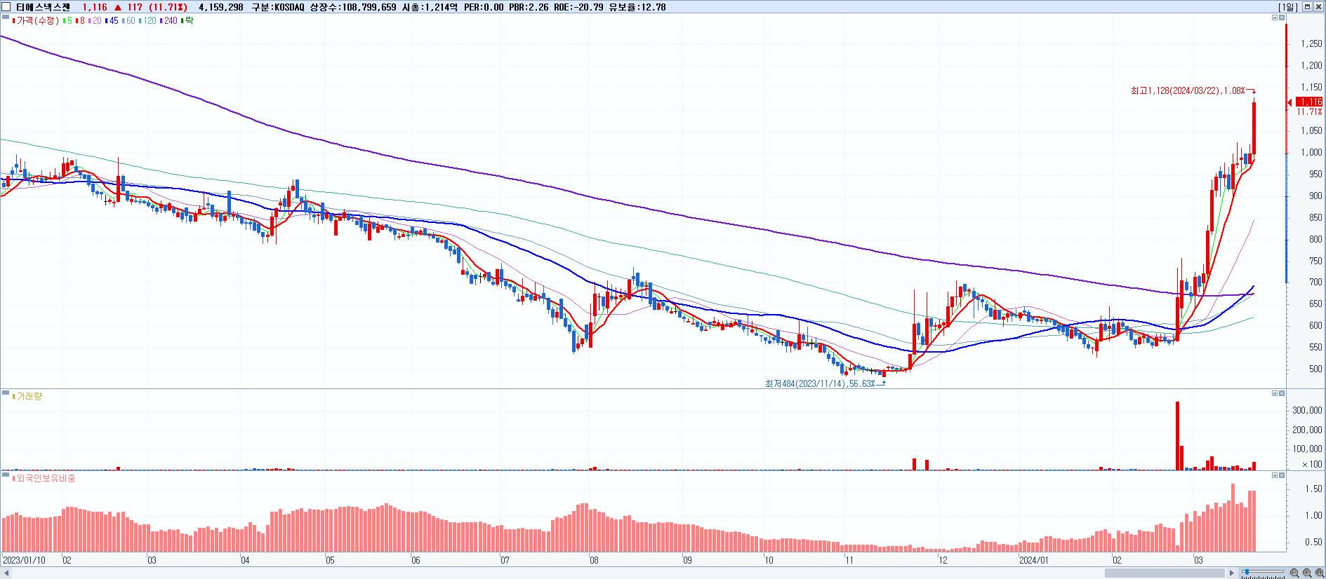 - 티에스넥스젠 (1,116원 ▲ 11.71% , 시총: 1,214억, 거래량: 4,159,398, 거래대금:45억, KOSDAQ)