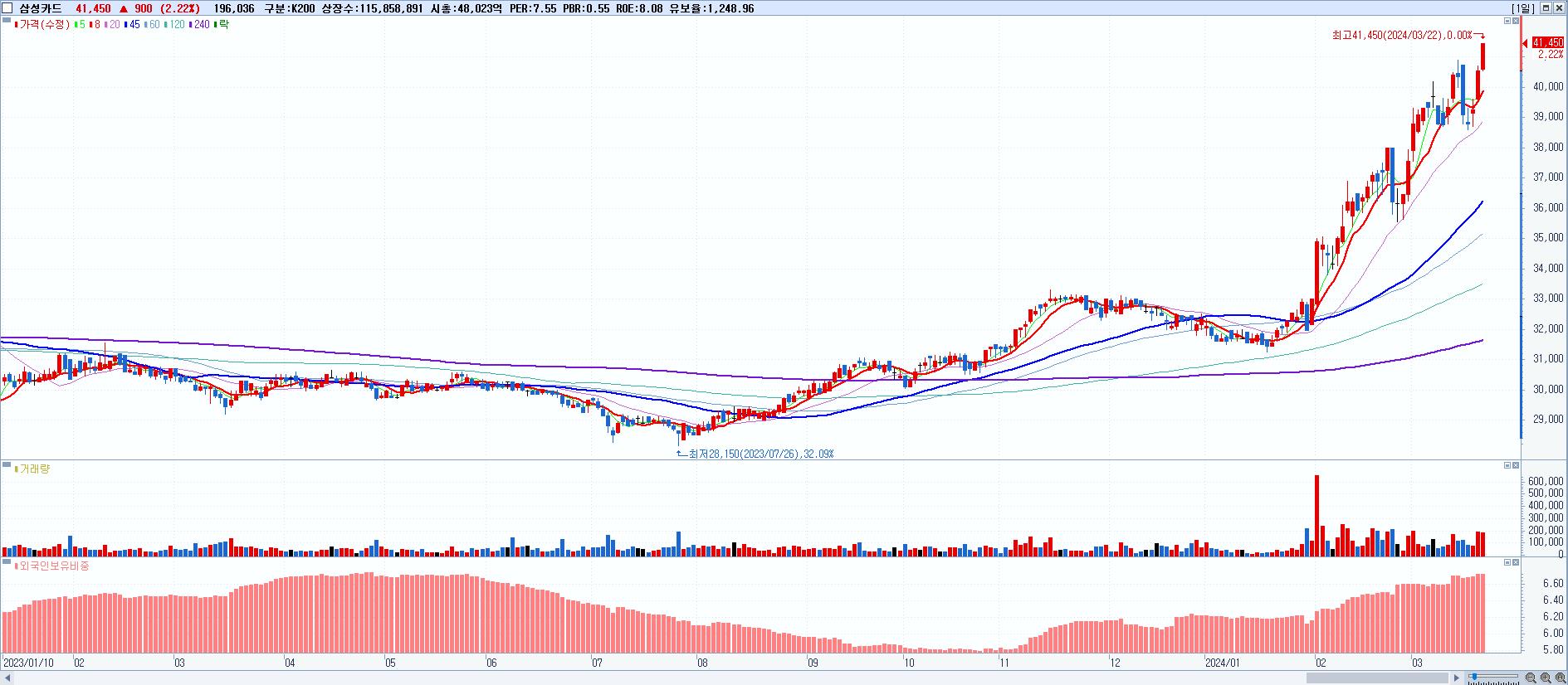 - 삼성카드 (41,450원 ▲ 2.22% , 시총: 48,024억, 거래량: 196,036, 거래대금:81억, KOSPI)
