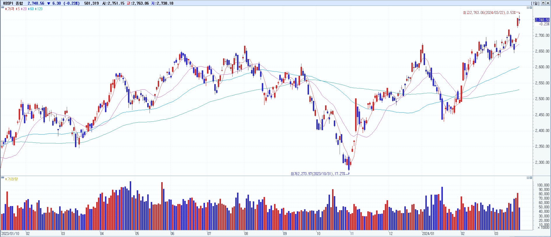 - 코스피가 전일 대비 소폭 하락해 2748.56에 마감, 단기 급등 후 조정