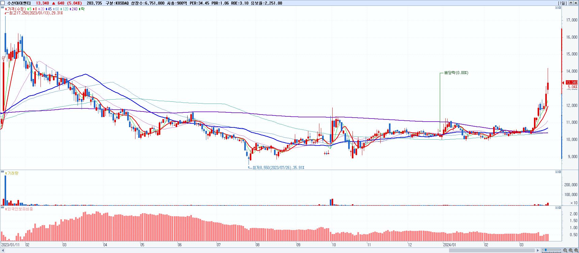 - 수산아이앤티 (13,340원 ▲ 5.04% , 시총: 901억, 거래량: 283,735, 거래대금:38억, KOSDAQ)