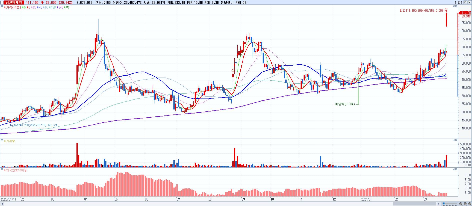 삼천당제약 111,100원 ▲ 29.94% (KOSDAQ, 000250)