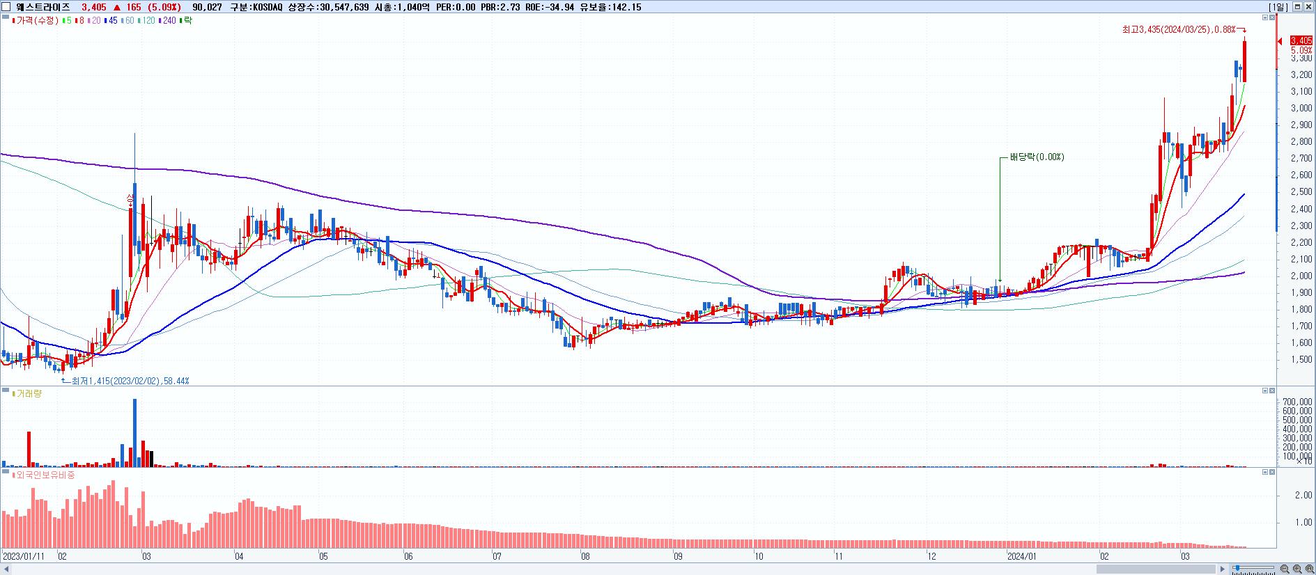 - 웨스트라이즈 (3,405원 ▲ 5.09% , 시총: 1,040억, 거래량: 90,027, 거래대금:3억, KOSDAQ)