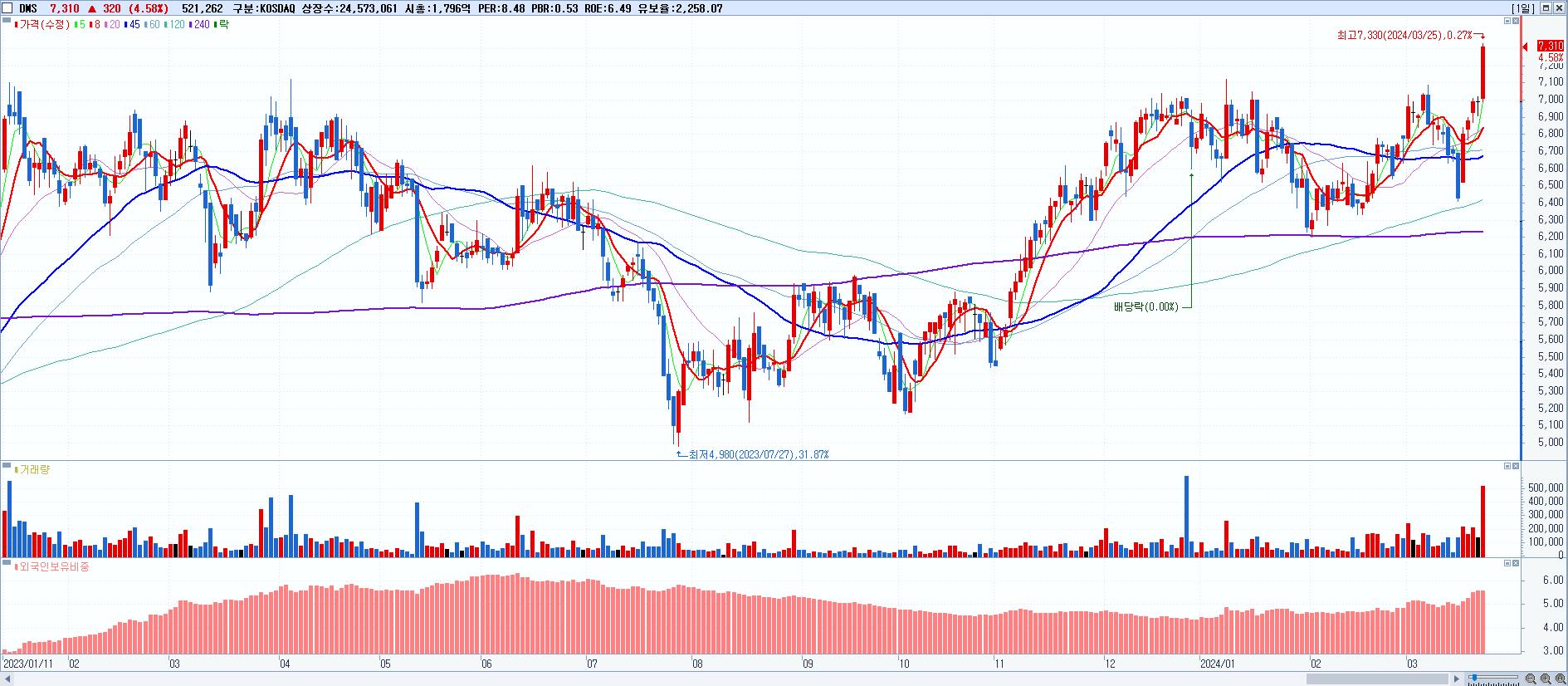 - DMS (7,310원 ▲ 4.58% , 시총: 1,796억, 거래량: 521,262, 거래대금:37억, KOSDAQ)