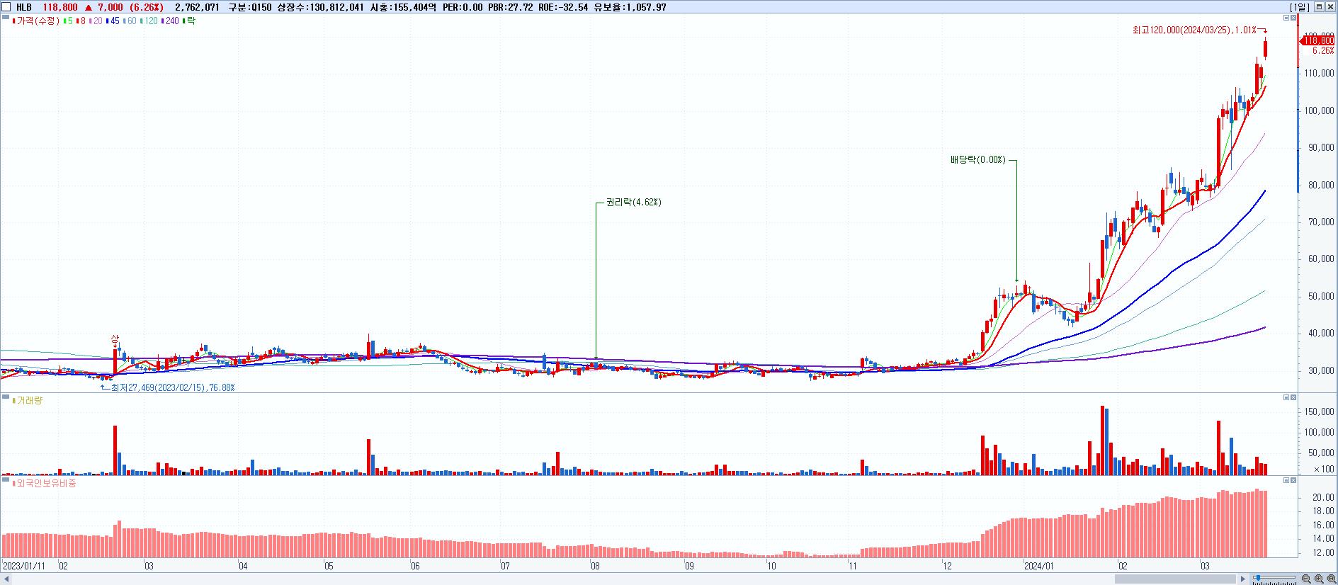 - HLB (118,800원 ▲ 6.26% , 시총: 155,405억, 거래량: 2,762,071, 거래대금:3,263억, KOSDAQ)