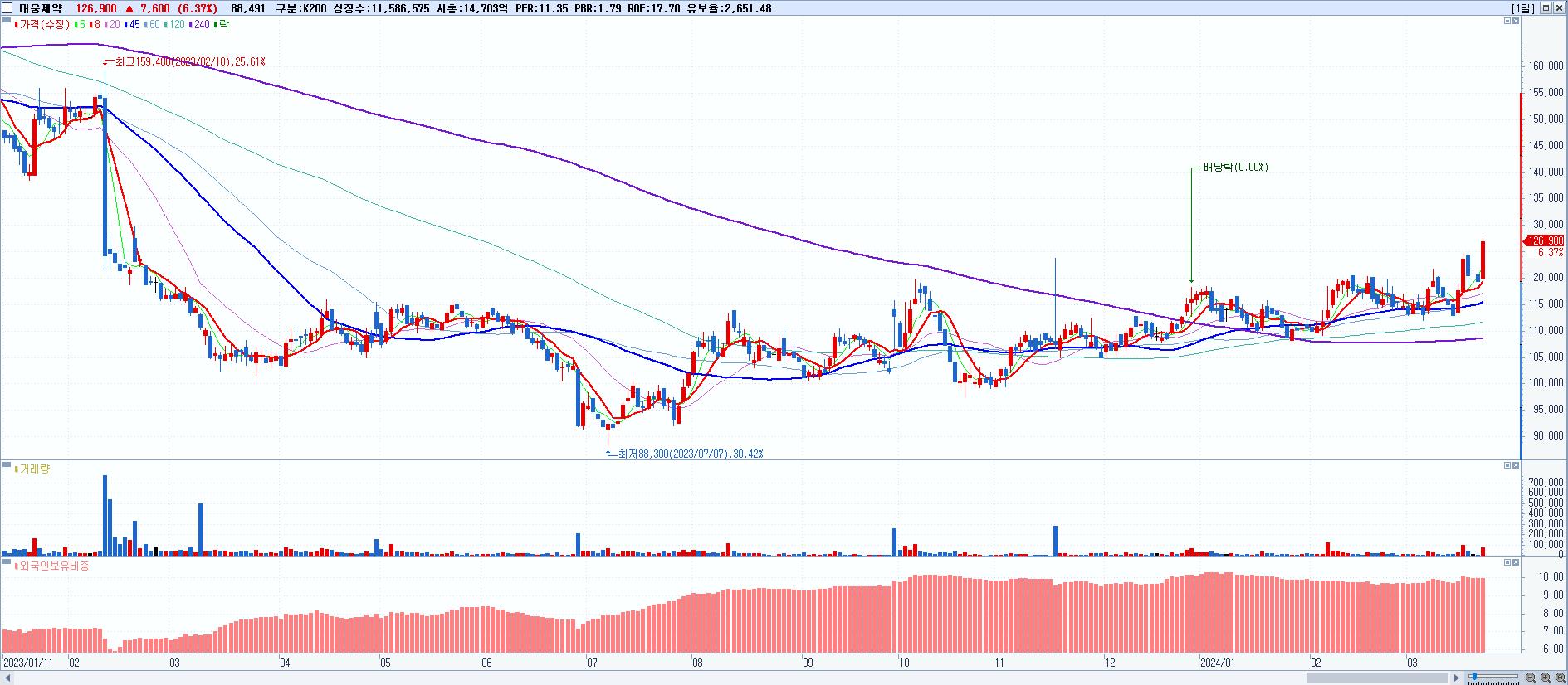 - 대웅제약 (126,900원 ▲ 6.37% , 시총: 14,703억, 거래량: 88,491, 거래대금:110억, KOSPI)