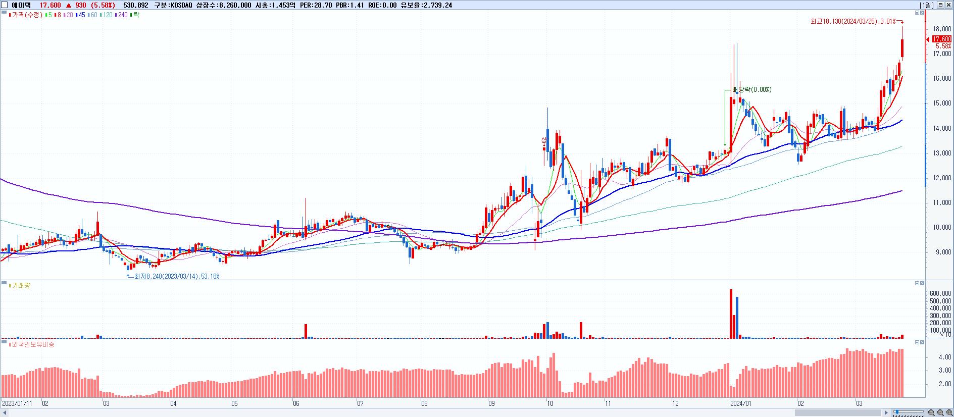 - 에이텍 (17,600원 ▲ 5.58% , 시총: 1,454억, 거래량: 530,892, 거래대금:93억, KOSDAQ)