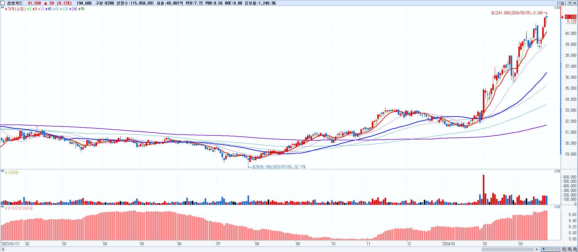- 삼성카드 (41,500원 ▲ 0.12% , 시총: 48,081억, 거래량: 194,606, 거래대금:80억, KOSPI)