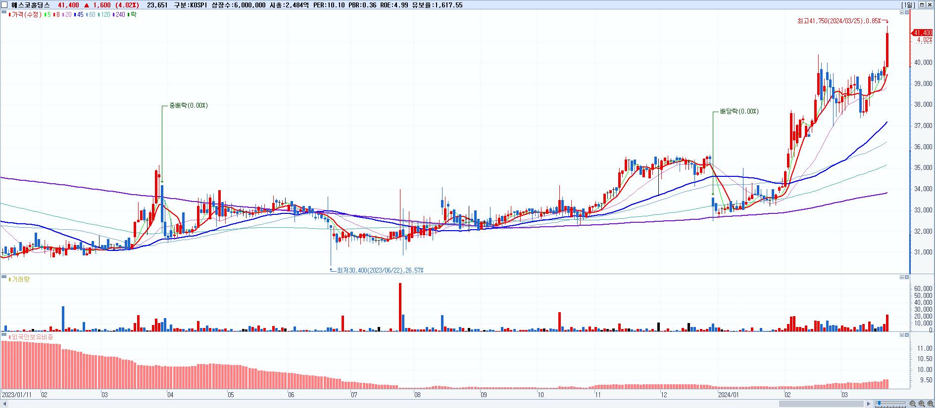 - 예스코홀딩스 (41,400원 ▲ 4.02% , 시총: 2,484억, 거래량: 23,651, 거래대금:10억, KOSPI)