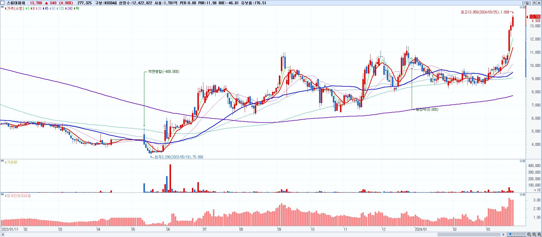 - 스피어파워 (13,700원 ▲ 4.9% , 시총: 1,702억, 거래량: 277,325, 거래대금:37억, KOSDAQ)