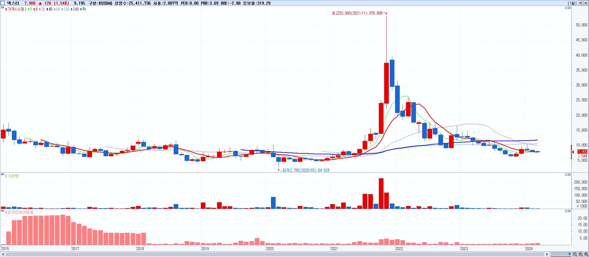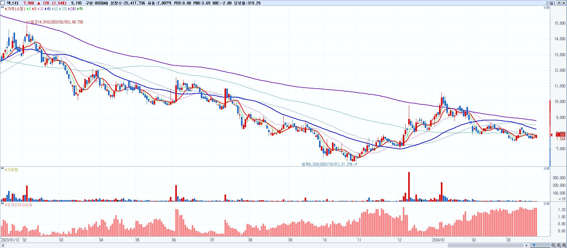 덱스터 (7,780원 , 시총: 1,977억, 거래량: 53,487, 거래대금:4억)