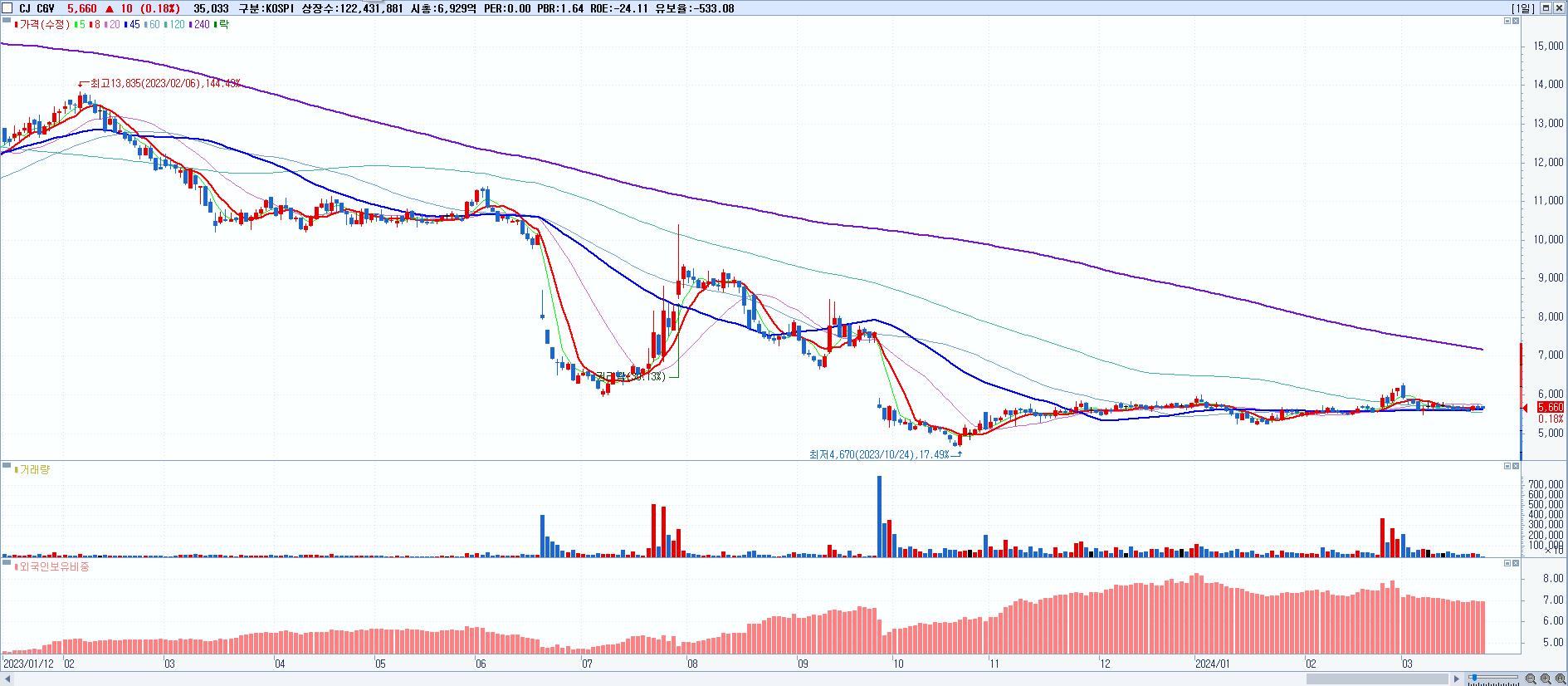 CJ CGV (5,650원 , 시총: 6,917억, 거래량: 292,518, 거래대금:17억)