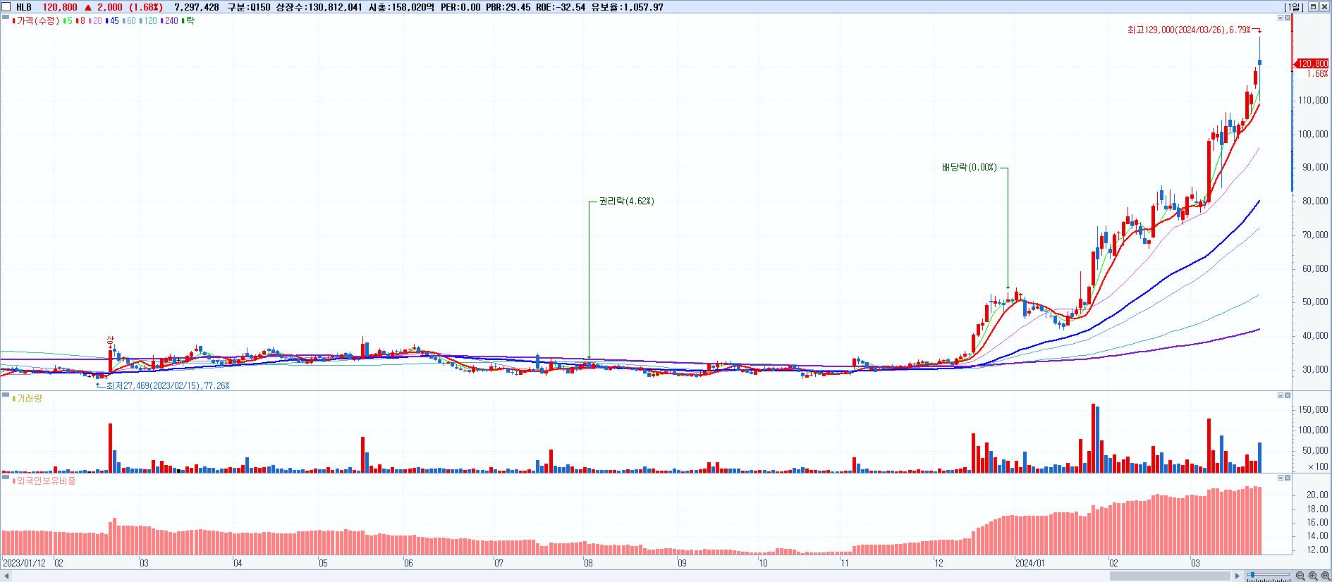 - HLB (120,800원 ▲ 1.68% , 시총: 158,021억, 거래량: 7,258,612, 거래대금:8,915억, KOSDAQ)