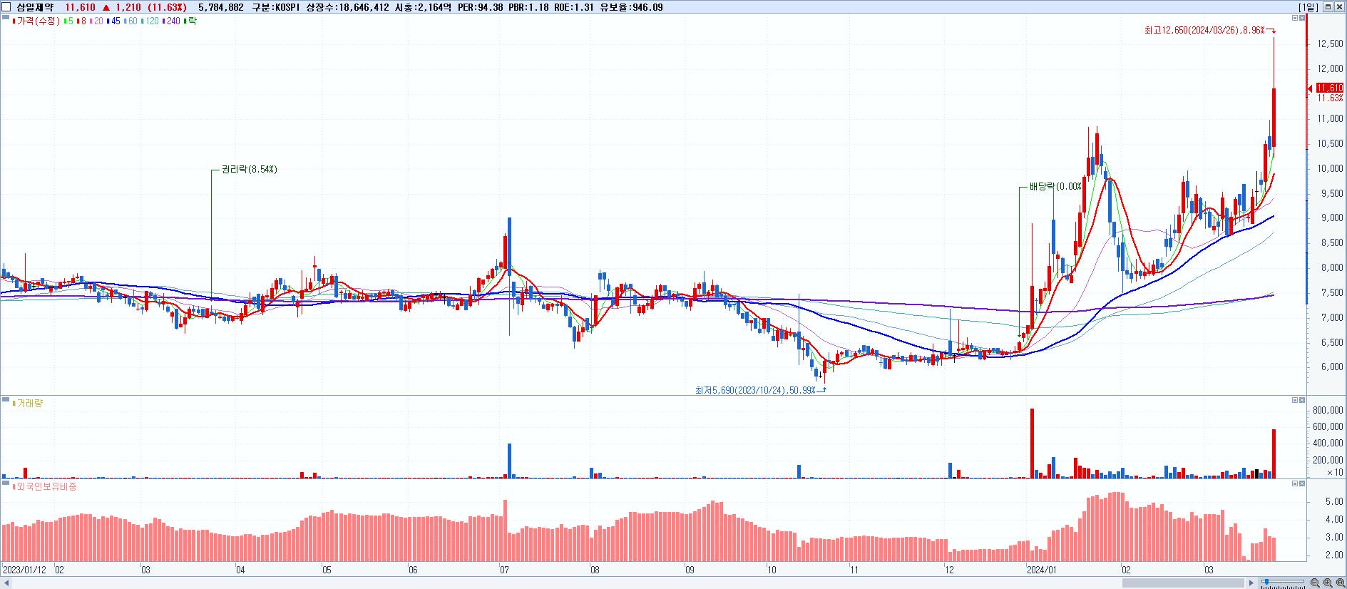 - 삼일제약 (11,610원 ▲ 11.63% , 시총: 2,165억, 거래량: 5,739,375, 거래대금:678억, KOSPI)