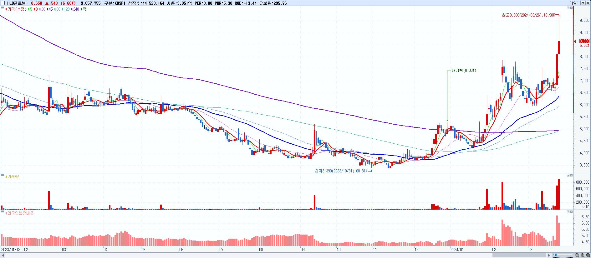 - HLB테라퓨틱스 (14,600원 ▲ 5.11% , 시총: 11,004억, 거래량: 15,233,234, 거래대금:2,240억, KOSDAQ)