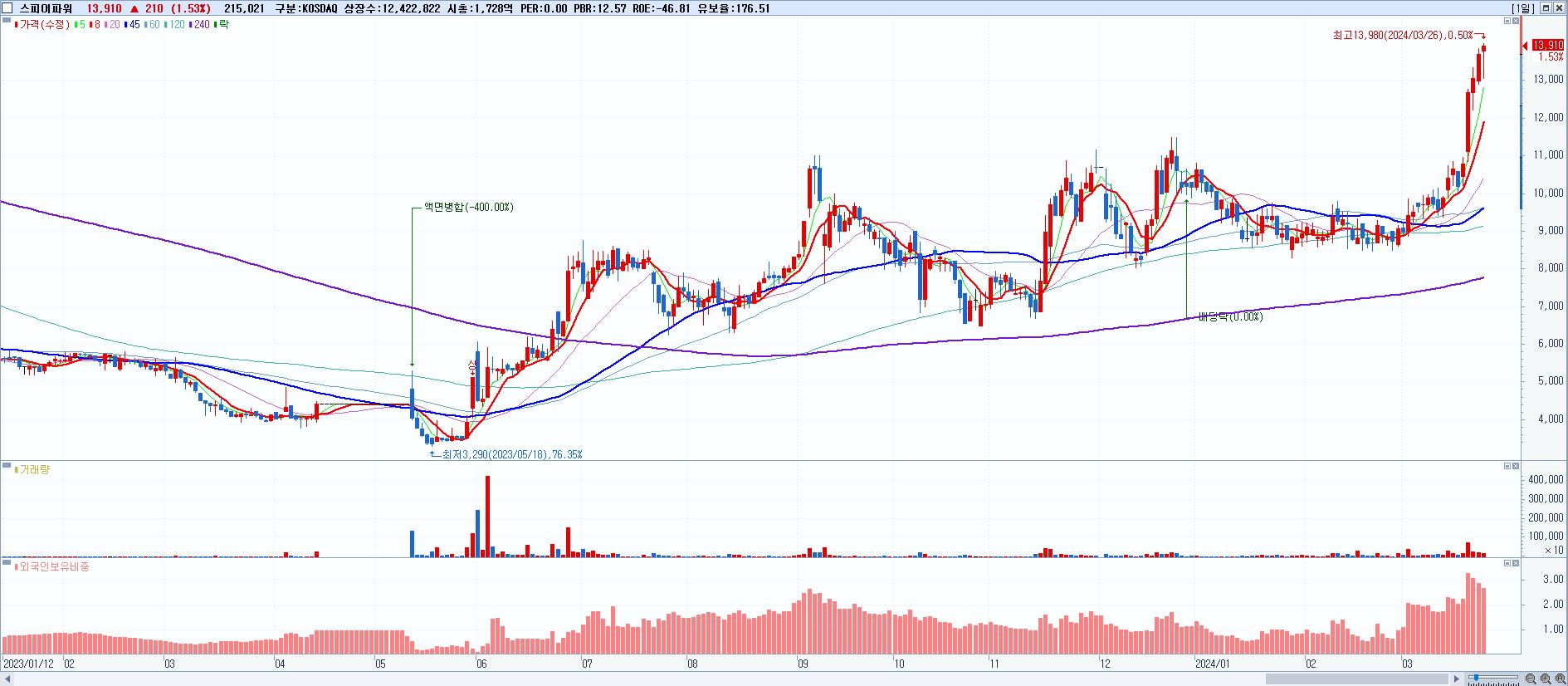 - 스피어파워 (13,910원 ▲ 1.53% , 시총: 1,728억, 거래량: 214,714, 거래대금:29억, KOSDAQ)