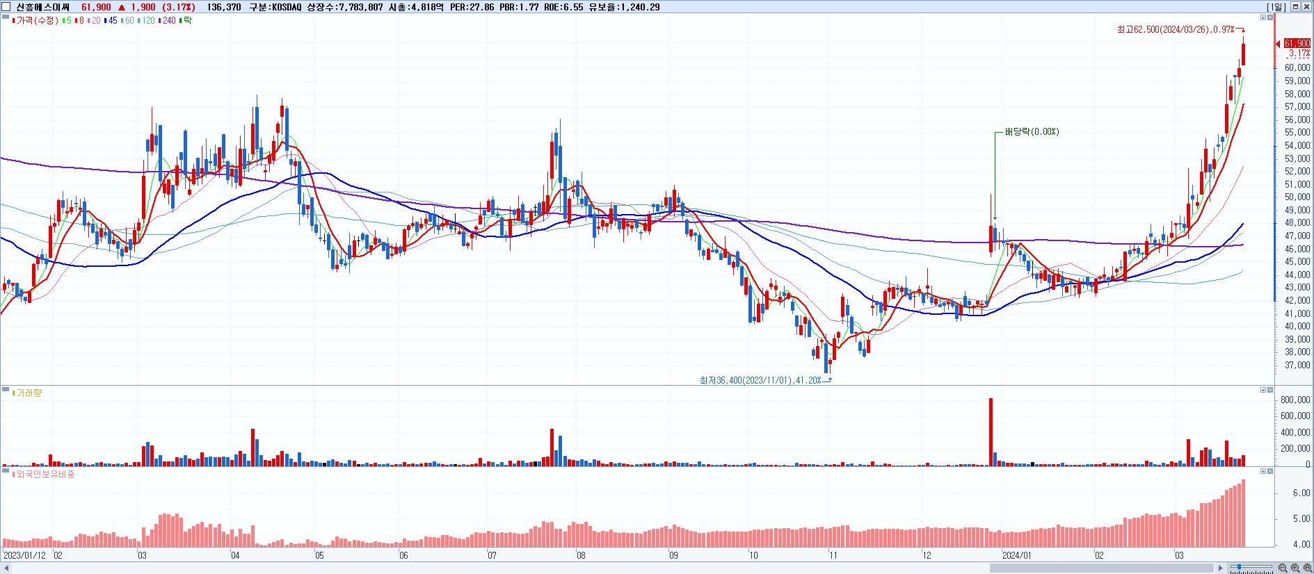- 신흥에스이씨 (61,900원 ▲ 3.17% , 시총: 4,818억, 거래량: 134,631, 거래대금:83억, KOSDAQ)