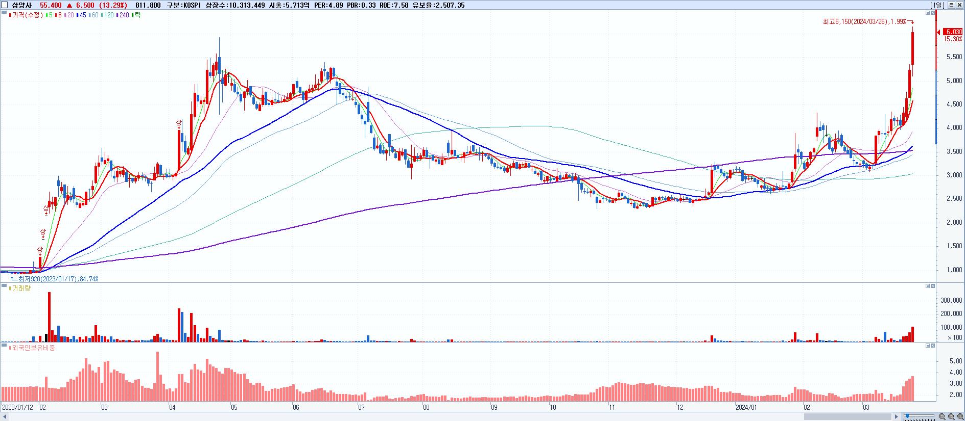 - 삼양사 (55,400원 ▲ 13.29% , 시총: 5,714억, 거래량: 806,152, 거래대금:455억, KOSPI)