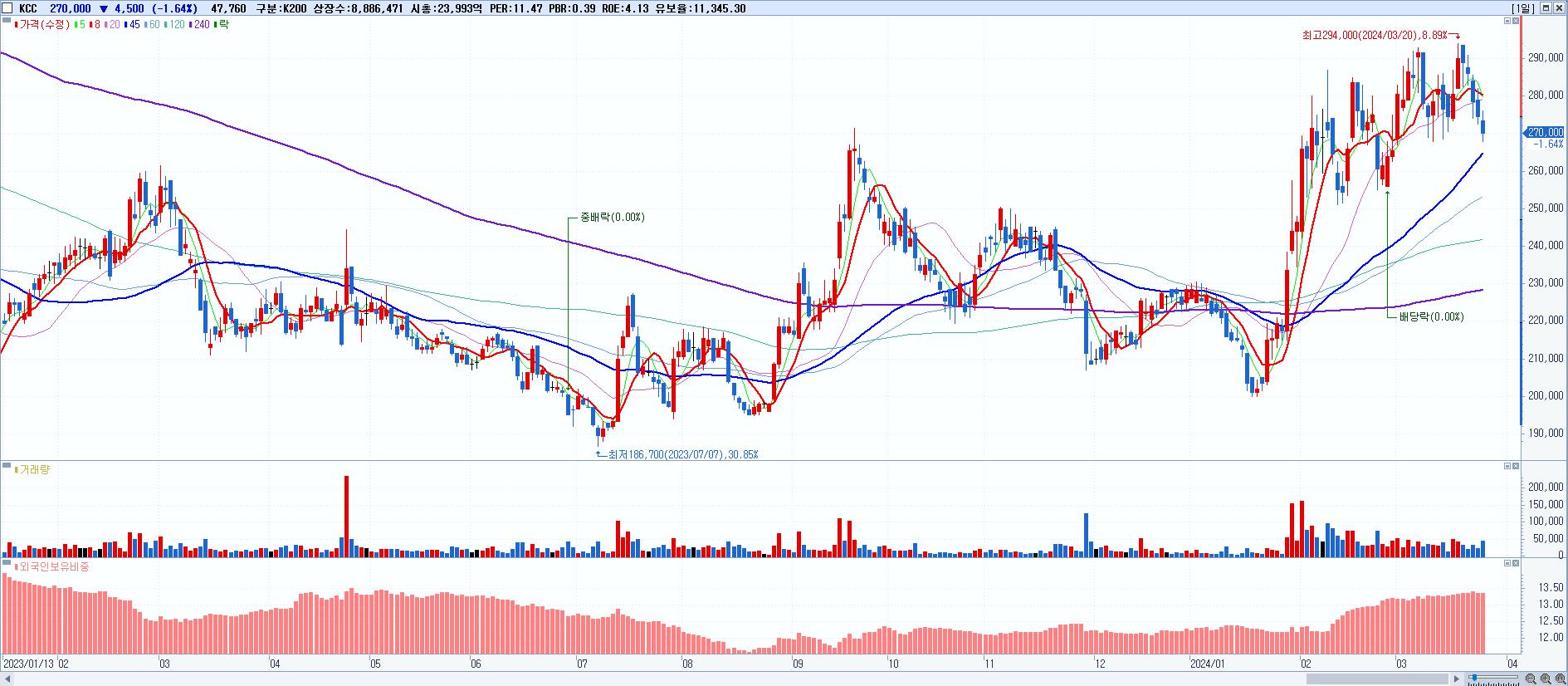 28.KCC 270,000원 ▼ -1.64% (KOSPI, 002380)