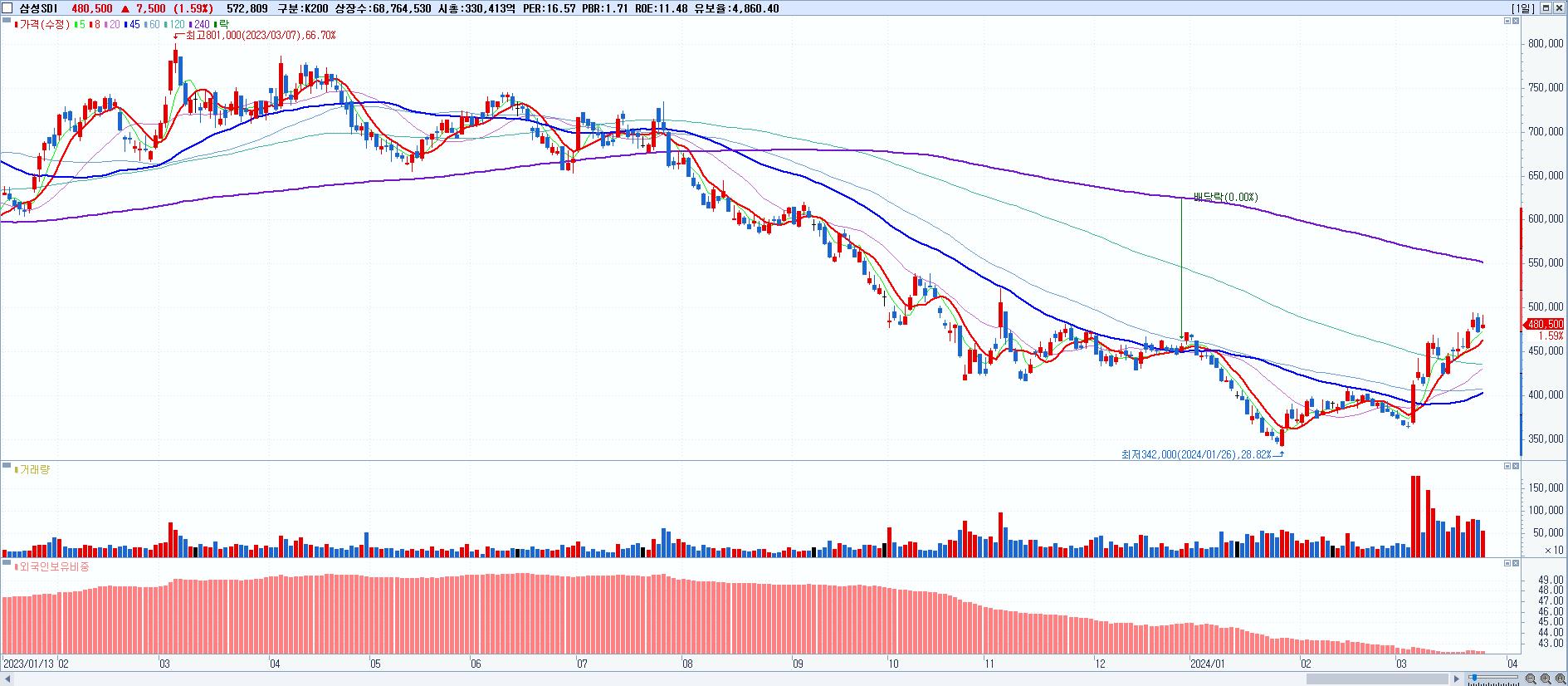 - 삼성SDI (480,500원 ▲ 1.59% , 시총: 330,414억, 외국인 순매수 거래금:100억)