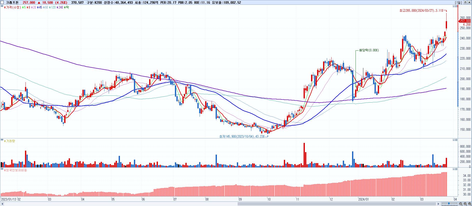 - 크래프톤 (257,000원 ▲ 4.26% , 시총: 124,297억, 외국인 순매수 거래금:225억)