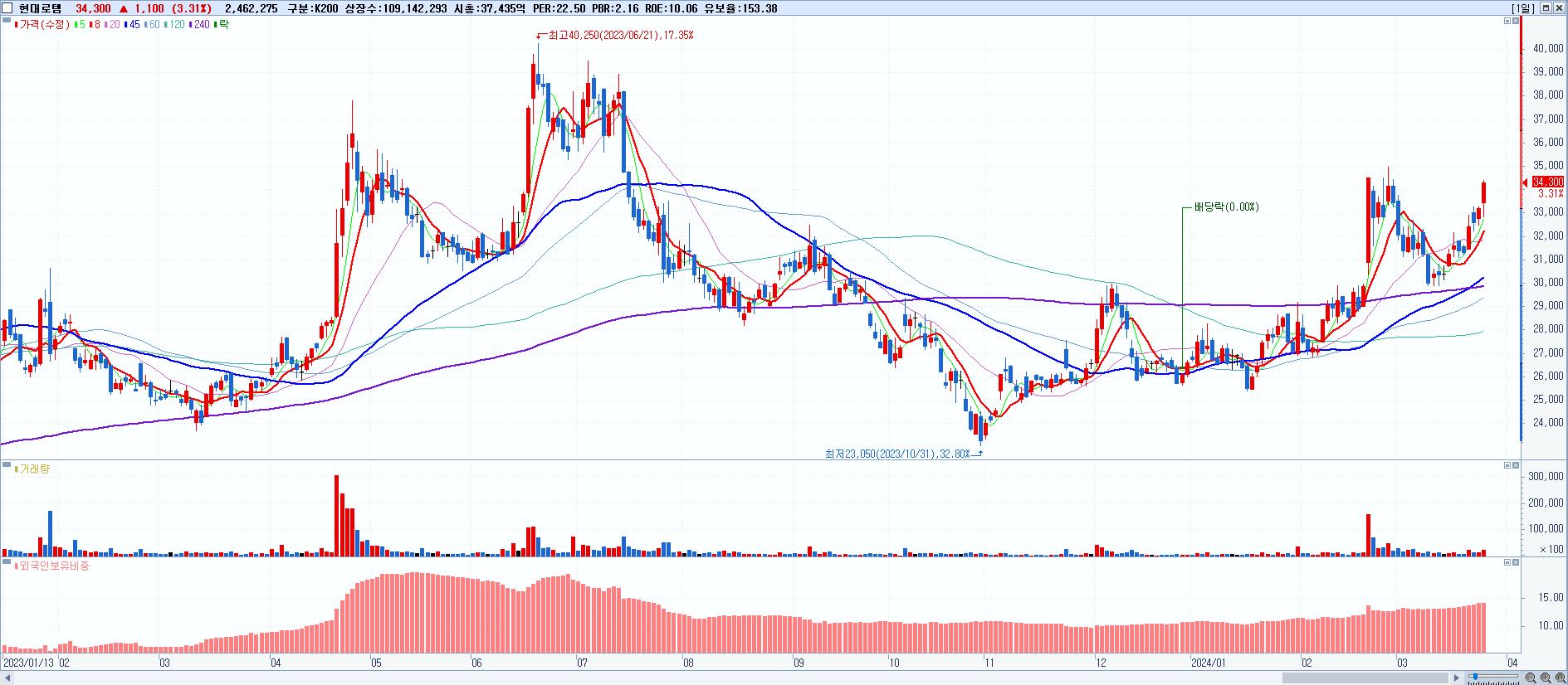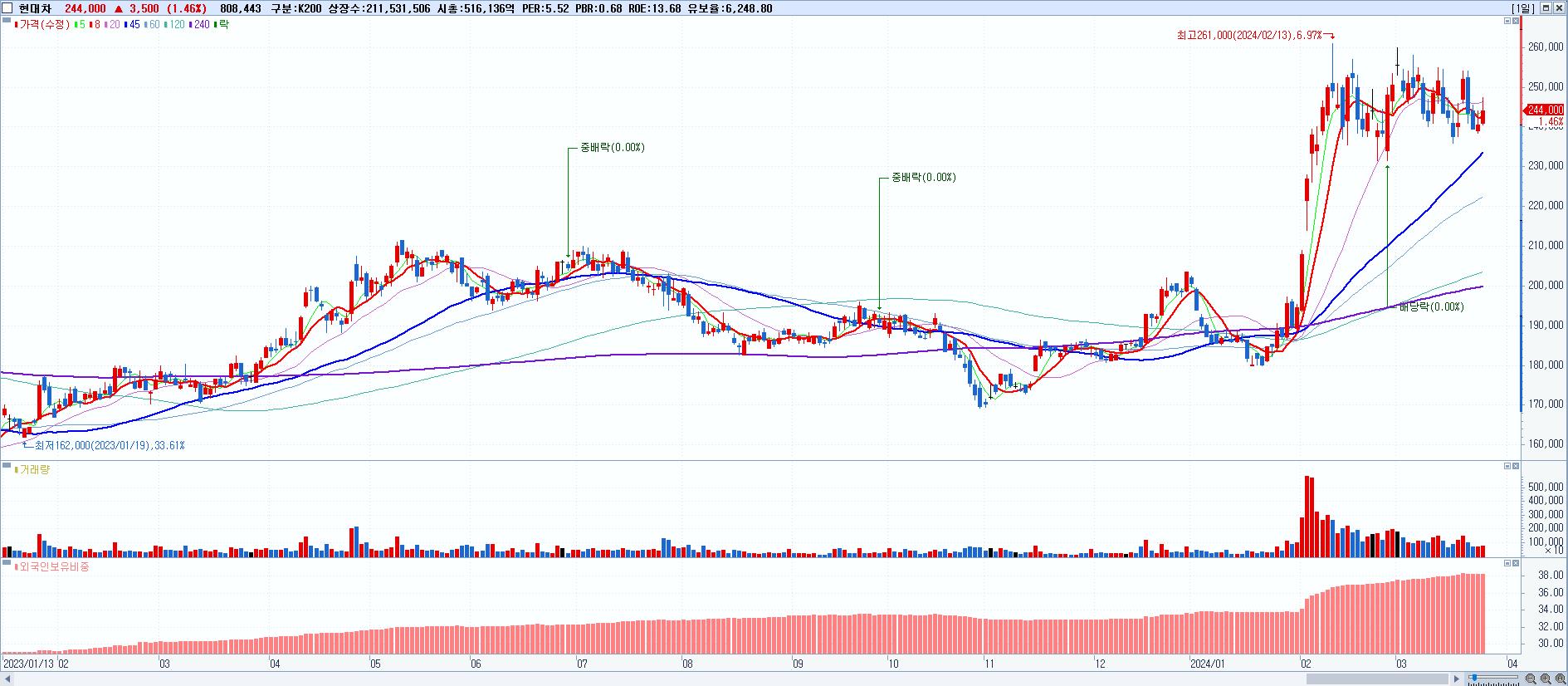 - 현대차 (244,000원 ▲ 1.46% , 시총: 516,137억, 외국인 순매수 거래금:402억)