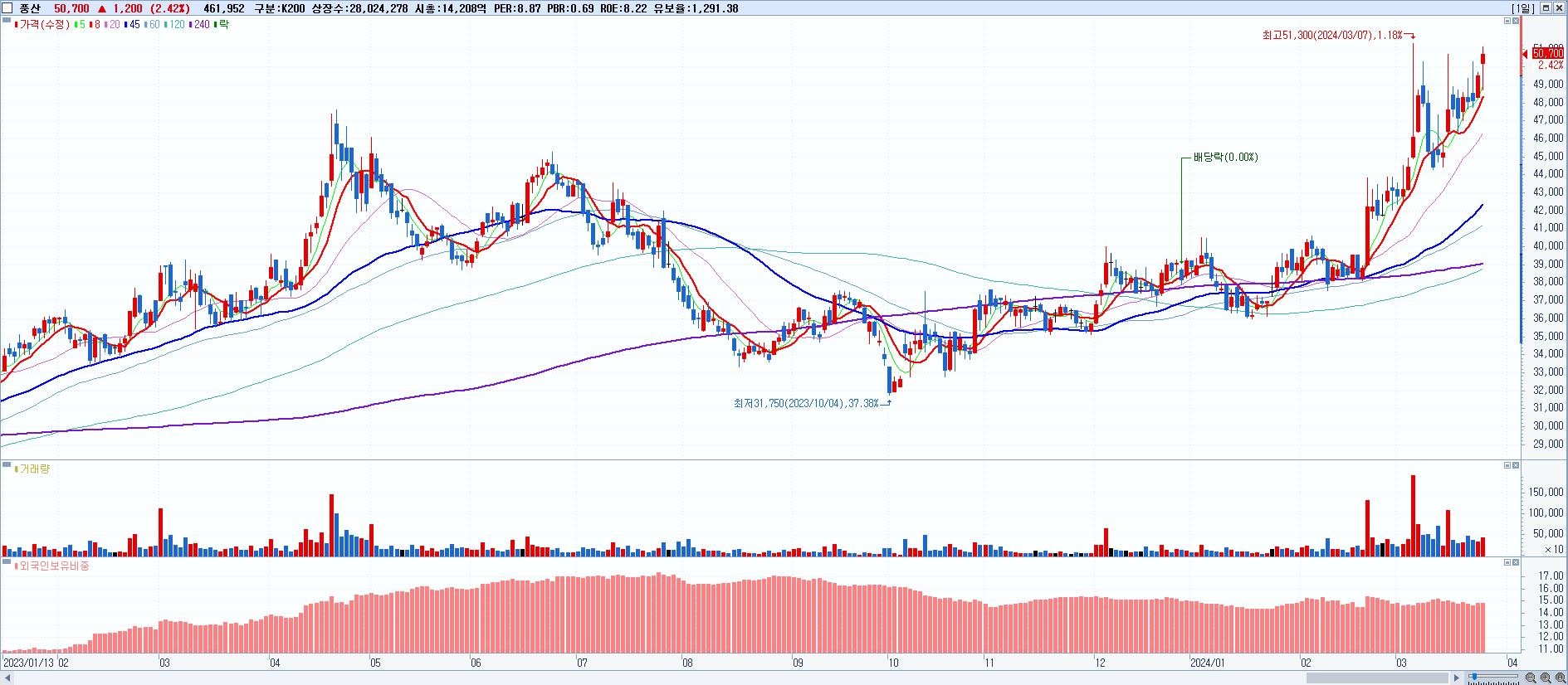 - 풍산 (50,700원 ▲ 2.42% , 시총: 14,208억, 외국인 순매수 거래금:51억)