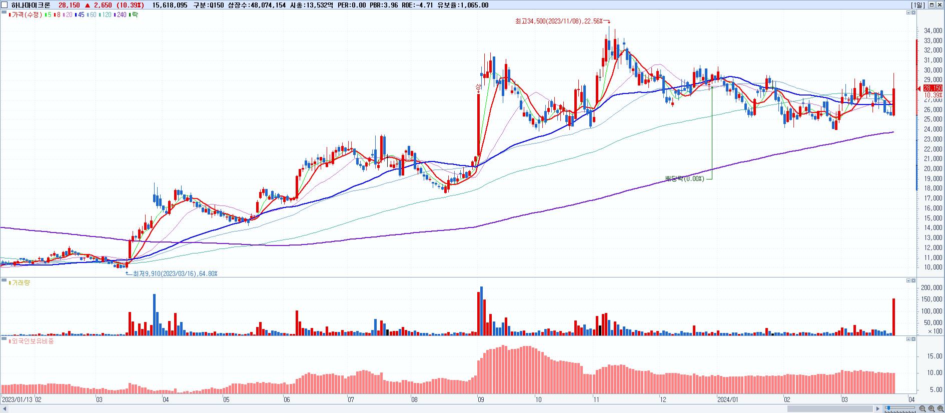 - 하나마이크론 (28,150원 ▲ 10.39% , 시총: 13,533억, 외국인 순매수 거래금:424억)