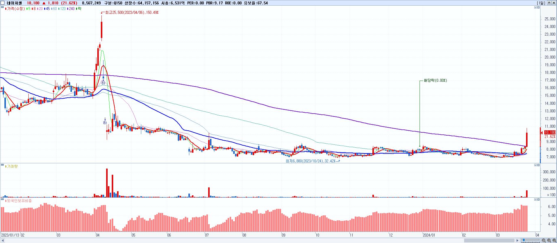 - 네이처셀 (10,180원 ▲ 21.62% , 시총: 6,531억, 외국인 순매수 거래금:46억)